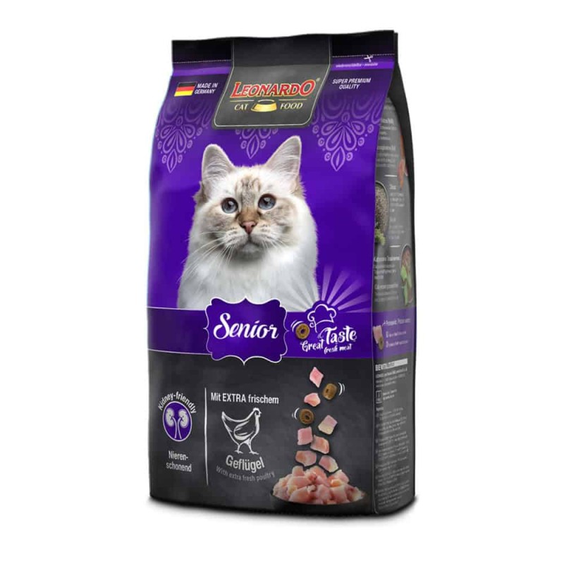 Η Leonardo Senior είναι η ιδανική ξηρά τροφή για ηλικιωμένες γάτες από την ηλικία των 10 ετών και άνω, με φρέσκο ψαχνό κρέας κοτόπουλου.