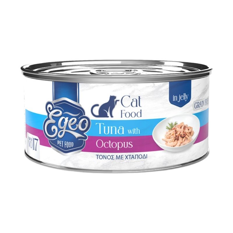 Λαχταριστή φυσική τροφή σε κονσερβάκια για γάτες. Με τόνο και χταπόδι. Σε ζελέ.