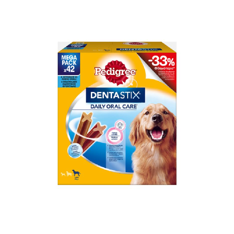 Τα Pedigree Dentastix μπορούν, επιστημονικώς αποδεδειγμένα, με καθημερινή χρήση να μειώσουν έως και 80% το σχηματισμό οδοντικής πλάκας, χάρη στο συνδυασμό της ειδικής υφής και των ουσιών με ενεργή, καθαριστική δράση.
