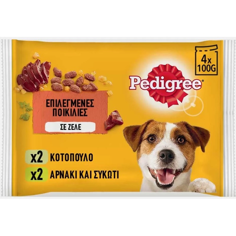 Πλήρης υγρή τροφή για ενήλικους σκύλους. Τέσσερα φακελάκια με κοτόπουλο και αρνί. Σε ζελέ.